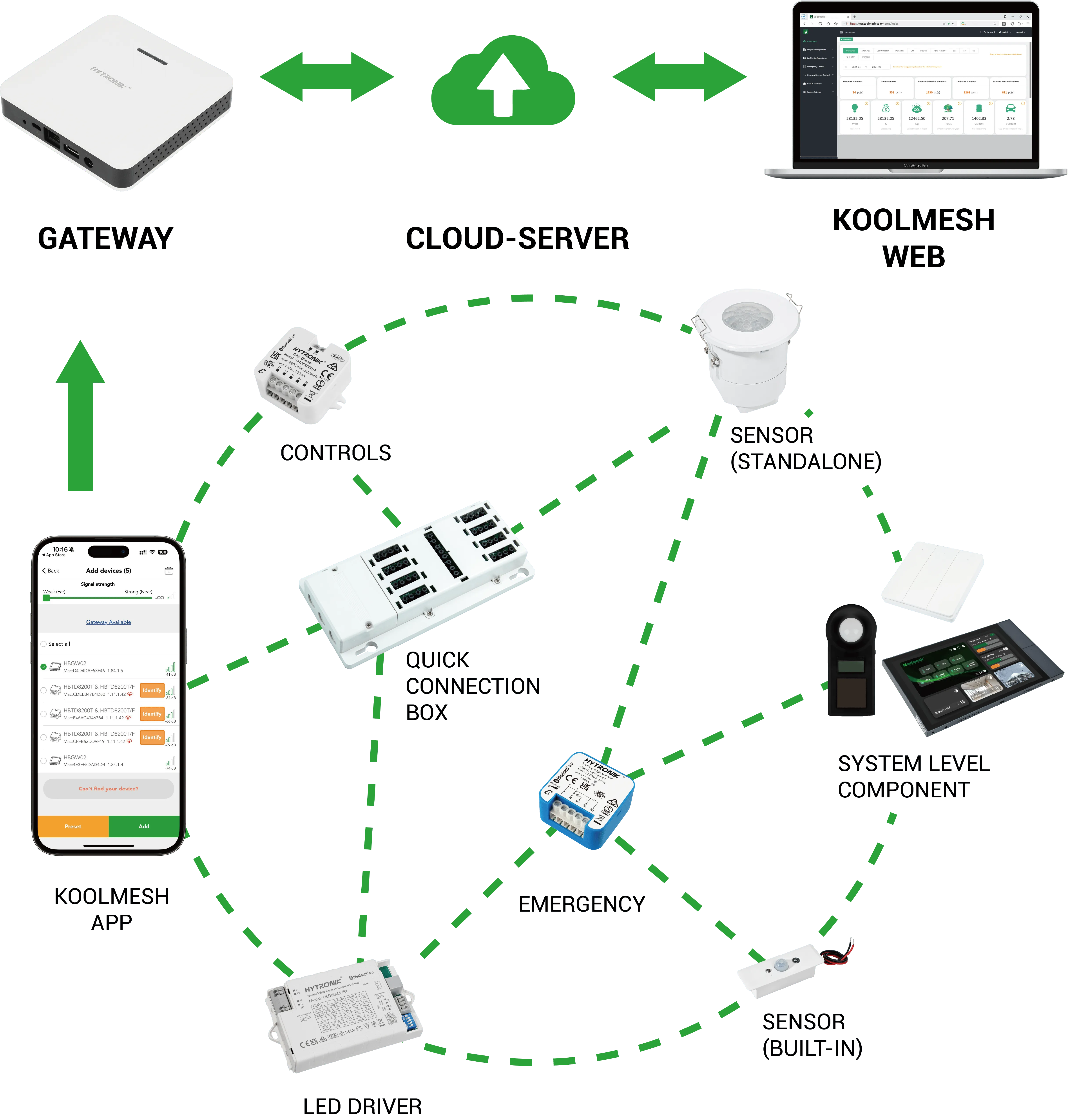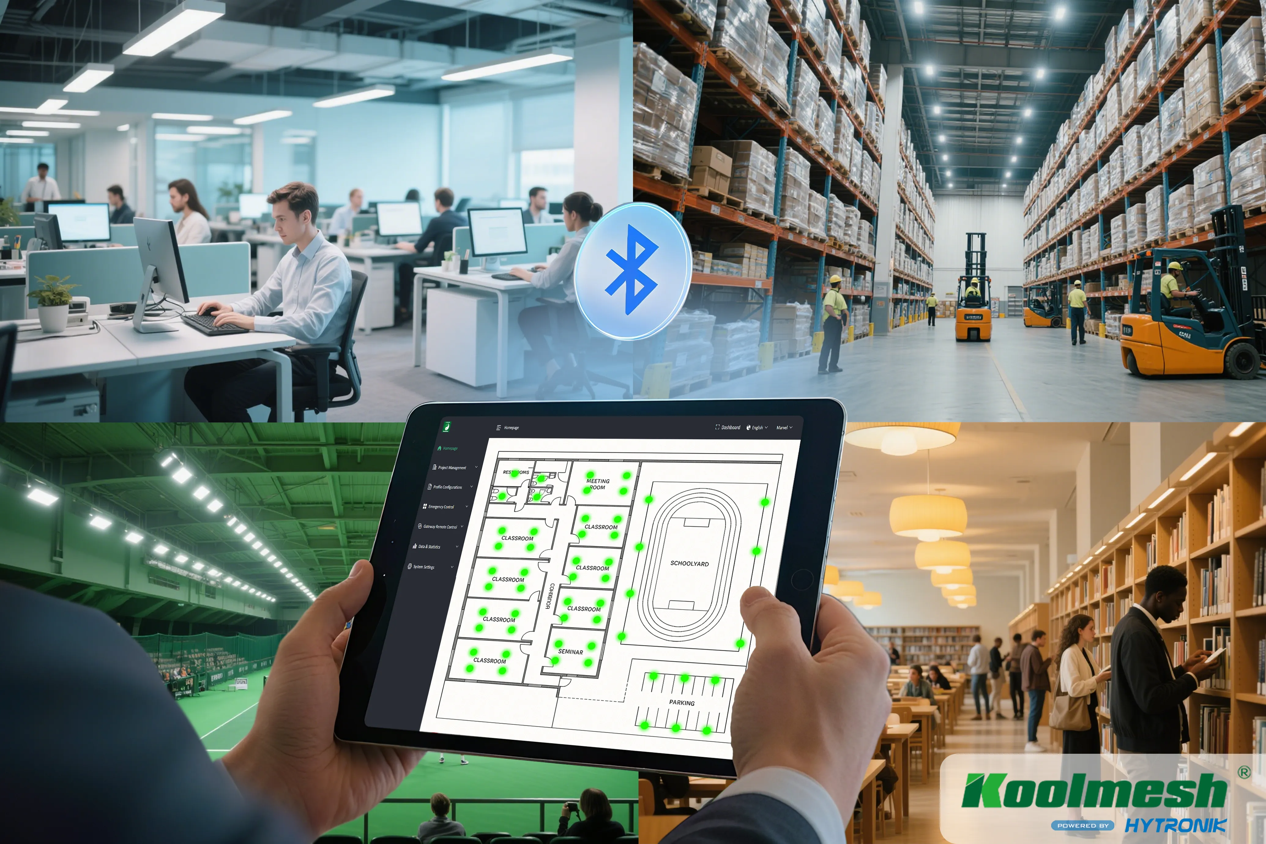 Koolmesh ist das professionelle Lichtsteuerungssystem von Hytronik – eine hochwertige, kosteneffiziente Alternative zu Casambi, Wirepas oder DALI+, vollständig integrierbar in BMS-Plattformen.