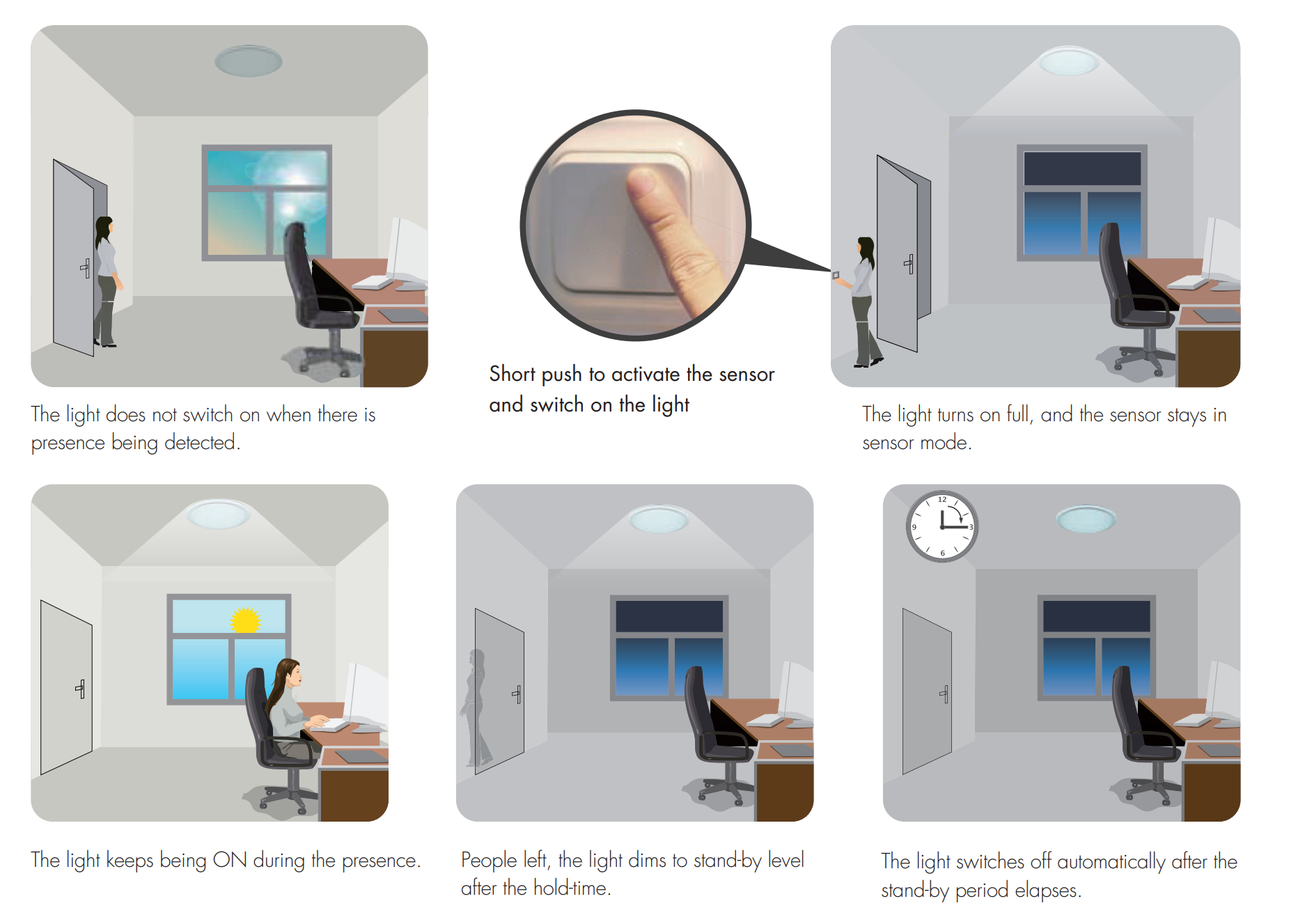 In Semi-auto Mode, also known as Absence Detection, the lighting will only turn on after a manual press of the wall switch. After that: