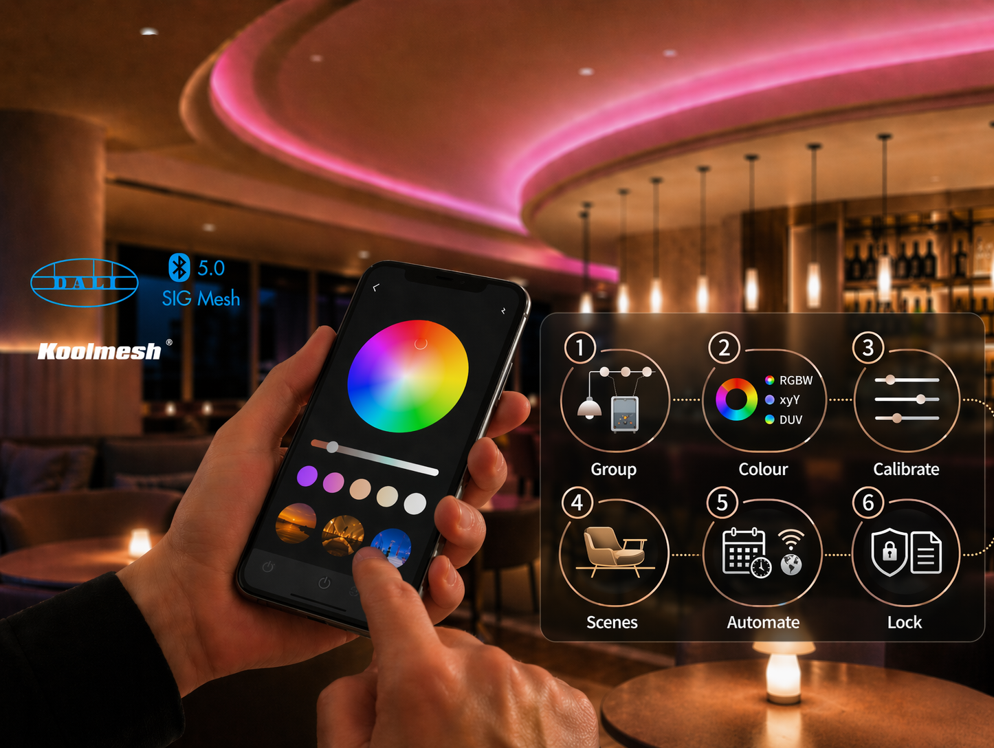Bring the simplicity of Bluetooth and Koolmesh into DALI RGBW projects, while keeping precise colour control for professional applications.